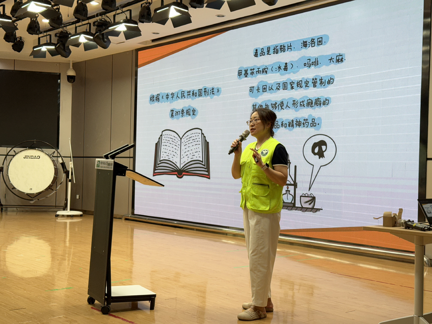 活动现场,身着整齐校服、系着鲜艳红领巾的同学们,目光牢牢锁定在投影屏幕上:从让学生好奇的传统毒品到伪装成“奶茶粉”“巧克力”的新型毒品,一张张图片、一段段案例讲解,让大家忍不住凑近座位、瞪大双眼。