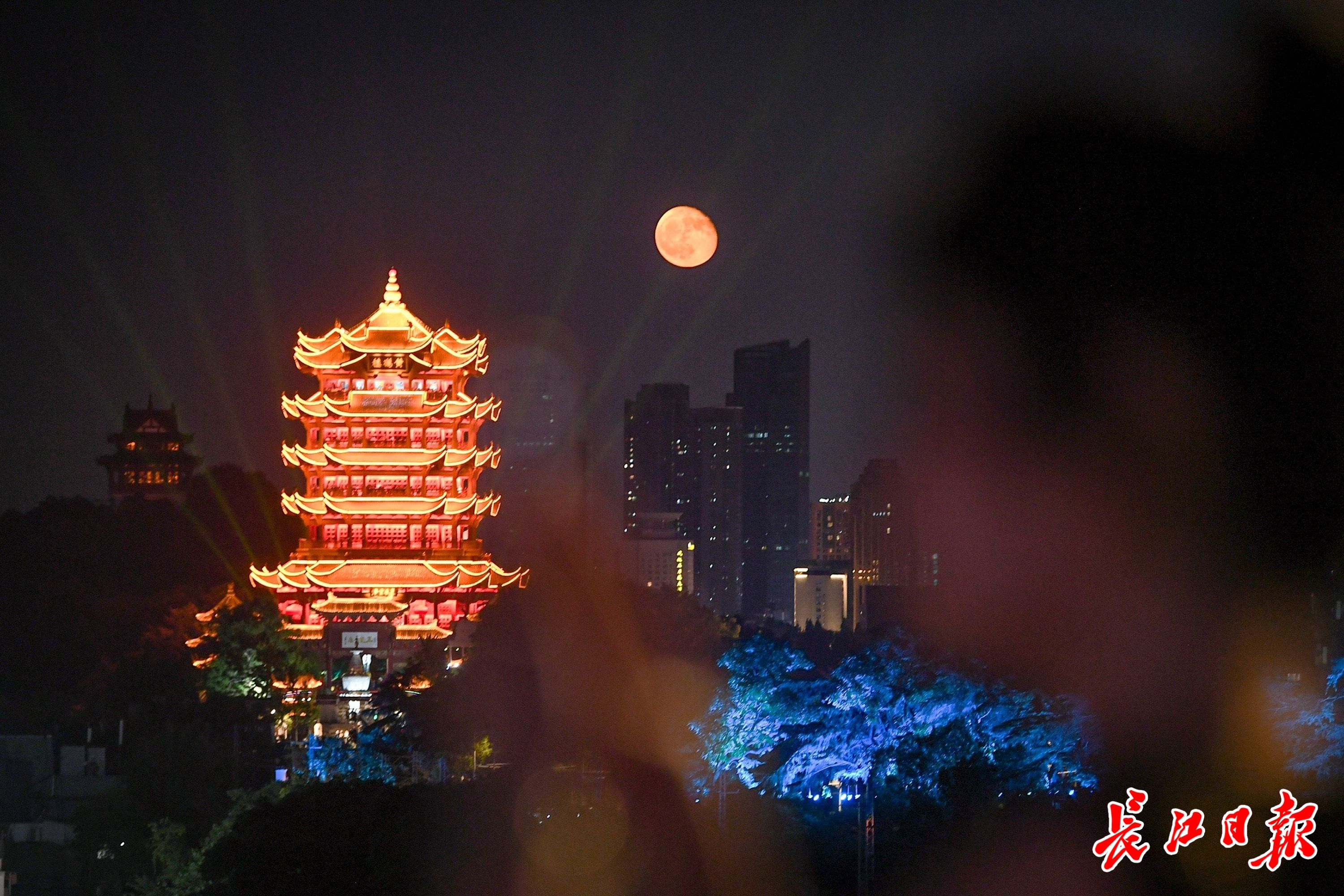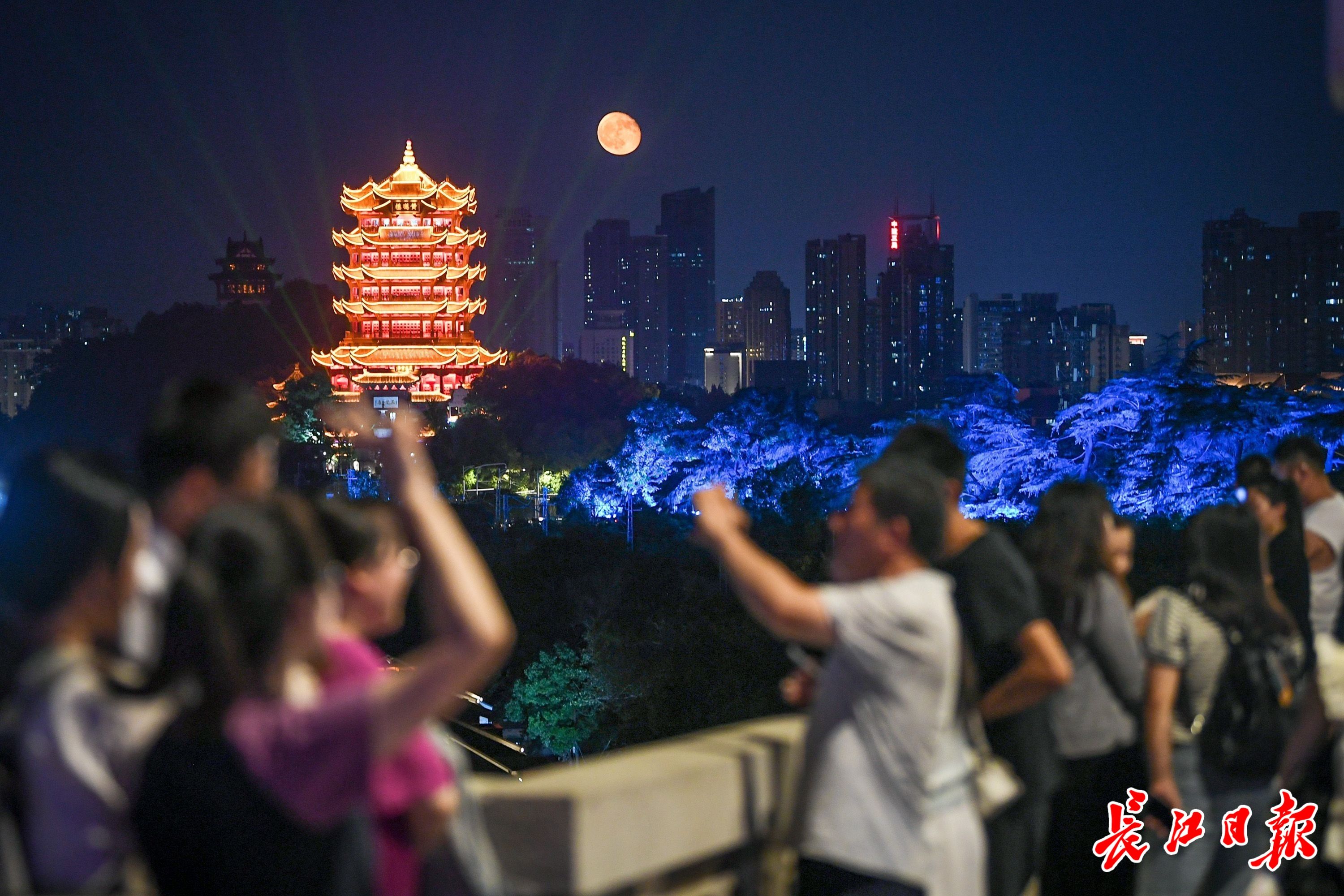 7月23日晚,游客在武汉长江大桥上驻足观看圆月悬空。