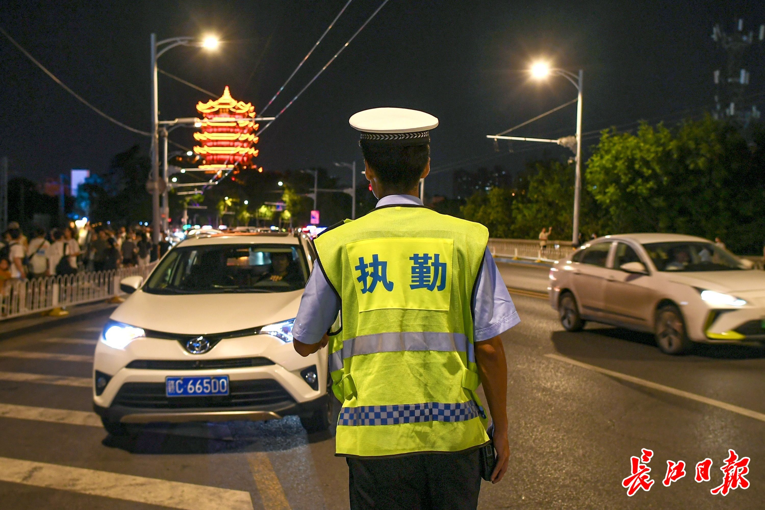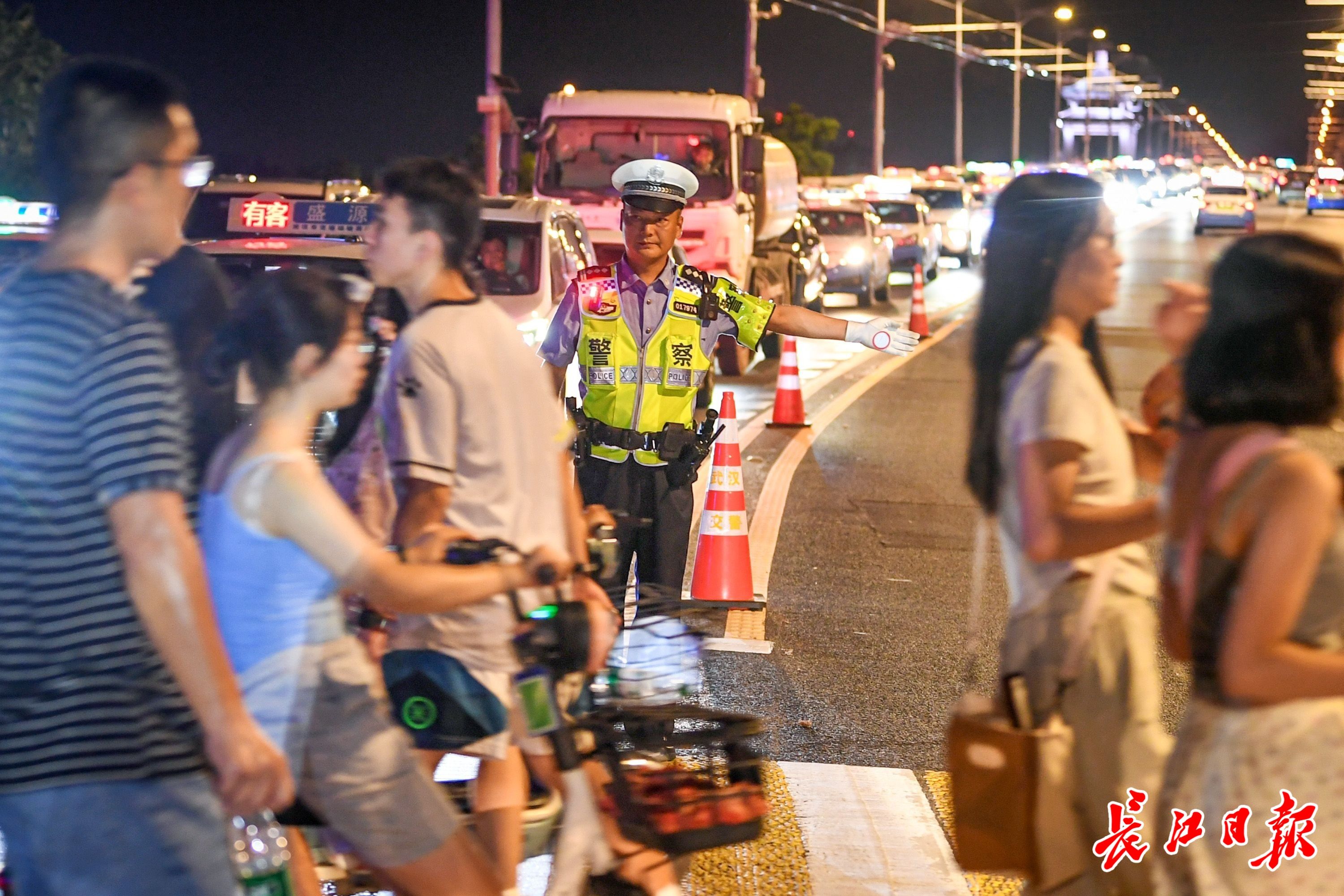 7月23日晚,交警在武汉长江大桥汉阳桥头处引导游客过马路。