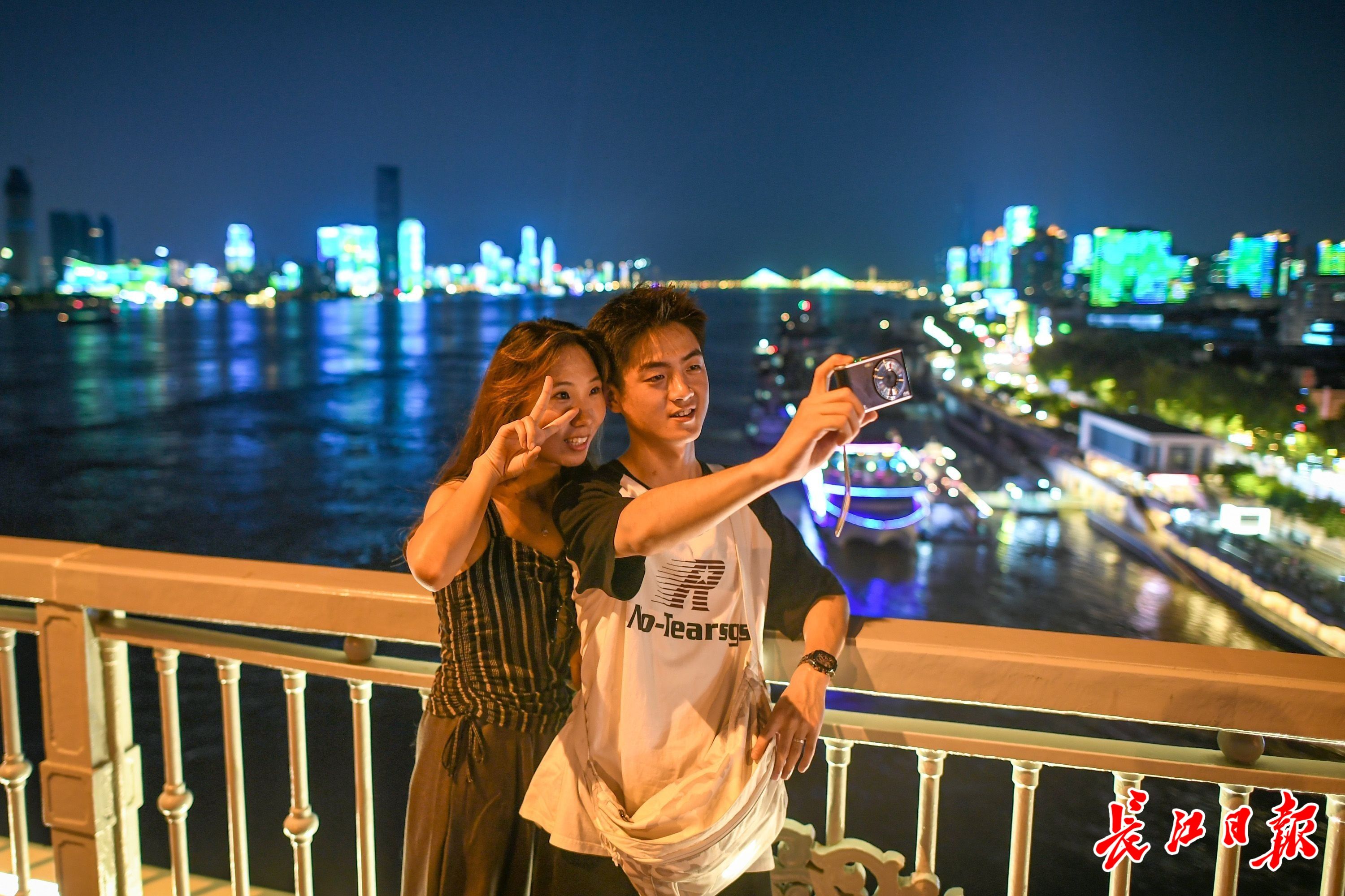 夏夜里,来自五湖四海的游客徒步长江大桥,观看两江四岸炫彩的灯光秀,感受夏夜武汉的魅力。据武汉市公安局交通管理局大桥大队统计,自6月下旬以来,夜游武汉长江大桥的游客成倍增长,双休日期间更是人流如潮。