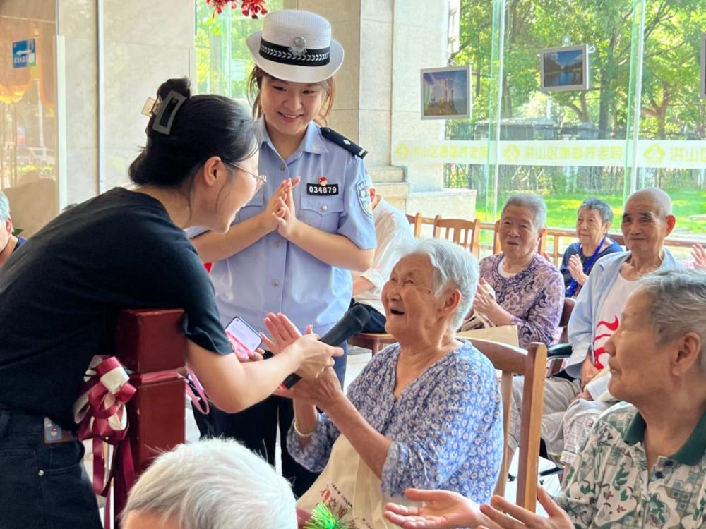 7月23日上午,洪山区保利心语康馨养老院一楼活动区,在交警带领下,老人们一起学习交通安全手指操、传唱起红色歌谣。
