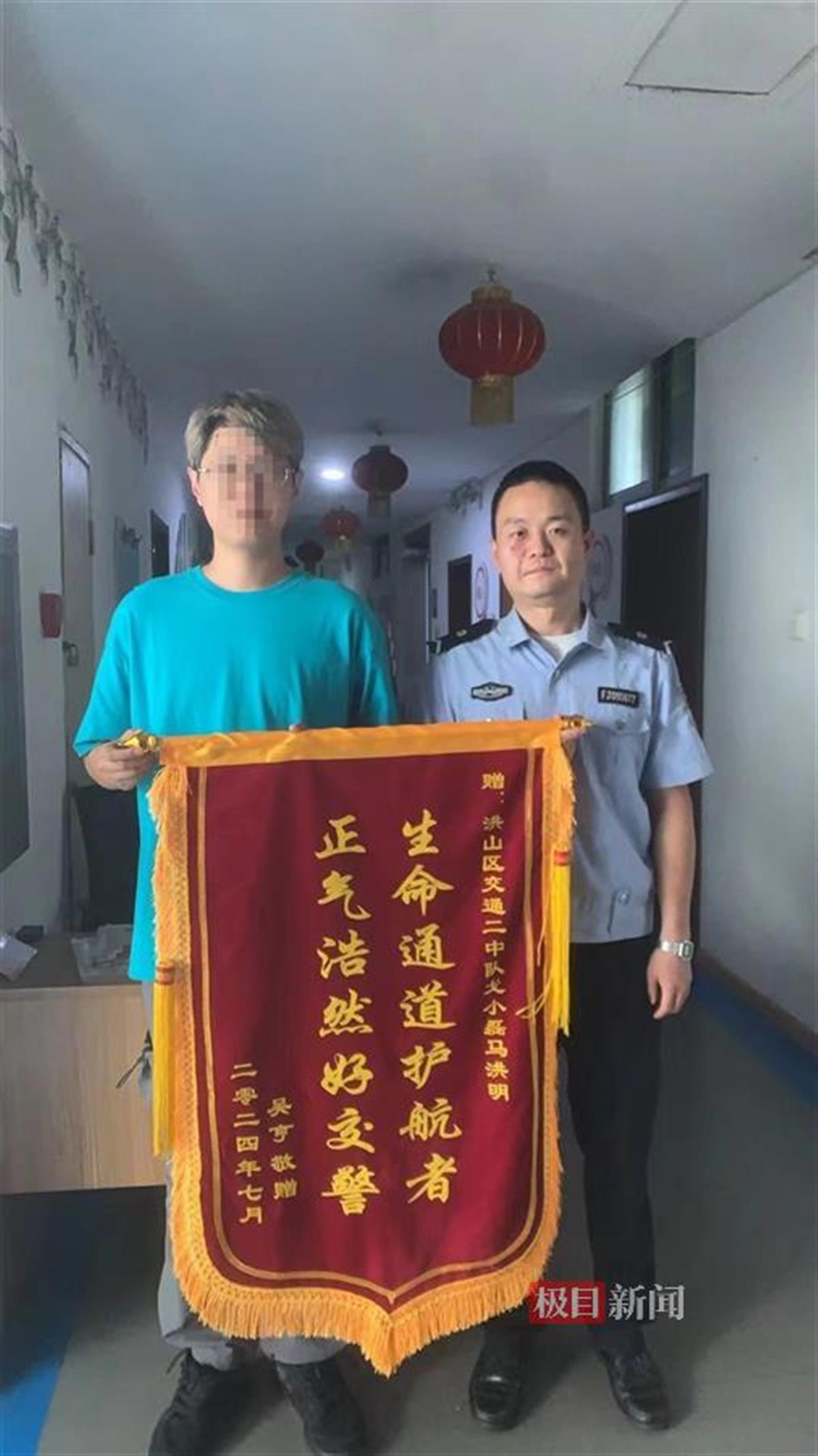 为了给患者争取更多的救治时间,民警随后联系上120救护车,在马房山转盘附近交通便利位置进行对接。7月29日,身体康复的吴先生特意制作了一面锦旗,送到洪山区交通大队二中队营区表示感谢。