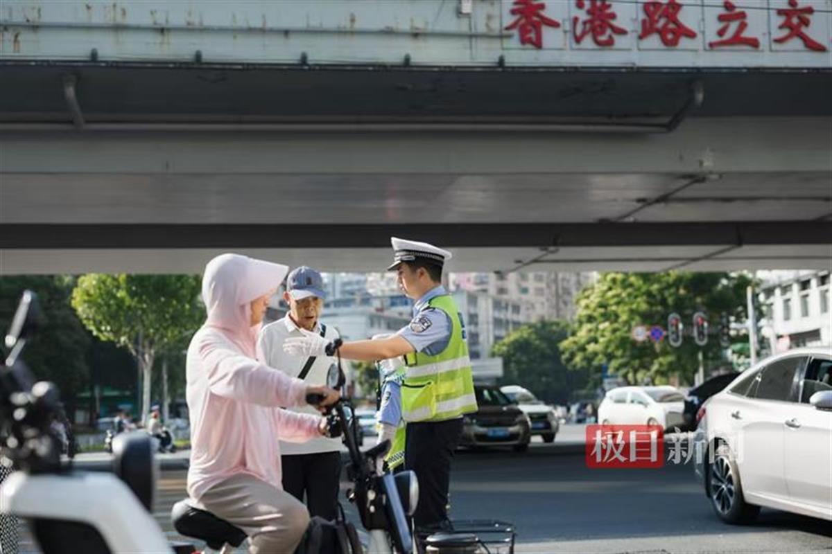 “才七点半,已经热浪滚滚,温度计的指针超过35度,我站到路上没一会儿,脑门上豆大的汗水直往下滴,真是太不容易了!”学生丁蔓琳对身旁的汉警快骑女子队员江雅莉说。