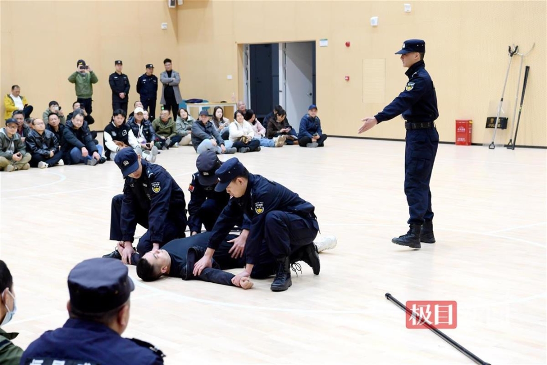 江岸公安分局快反教官李帆团队现场示范了防暴棍、防暴盾牌、警用钢叉、催泪喷射器等器械的正确使用方法,展示了面对应急情况,安保力量如何配合、如何先期处置等。