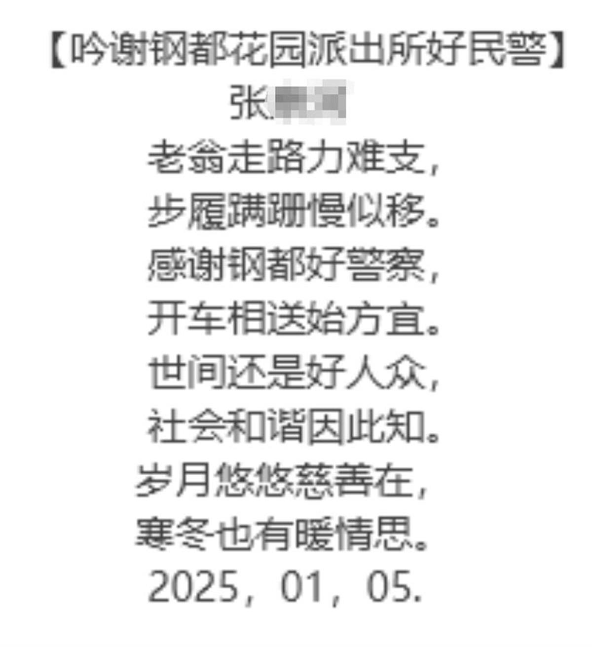 “老翁走路力难支,步履蹒跚慢似移。感谢钢都好警察,开车相送始方宜……”近日,武汉青山警方救助辖区居民张爹爹后,收到其自创的一首诗,字里行间洋溢着警民深情。