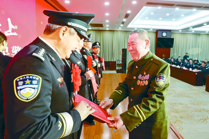 图为退休民警代表从退休民警、全国公安系统一级英雄模范邓泽顺手中接过聘书。应后威 摄