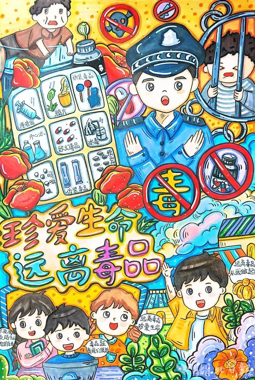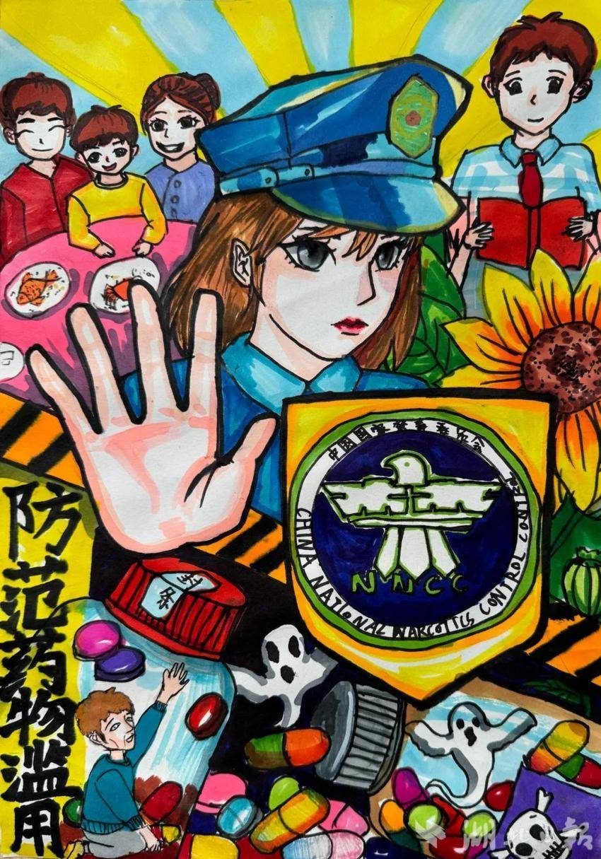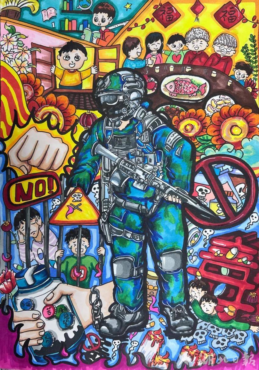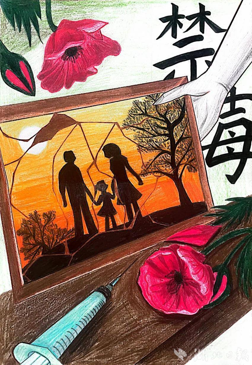 绘画组中,来自鲁巷实验小学的杨姝然同学的作品色彩鲜艳,充满童趣,整幅画通过生动的形象和细腻的笔触,显示出了孩子们对毒品的坚决抵制;华中师范大学附属保利南湖小学黄振辰同学则通过破碎的画框、红色罂粟花、注射器等元素,结合醒目的“禁”字,深刻传达了毒品对家庭的危害。