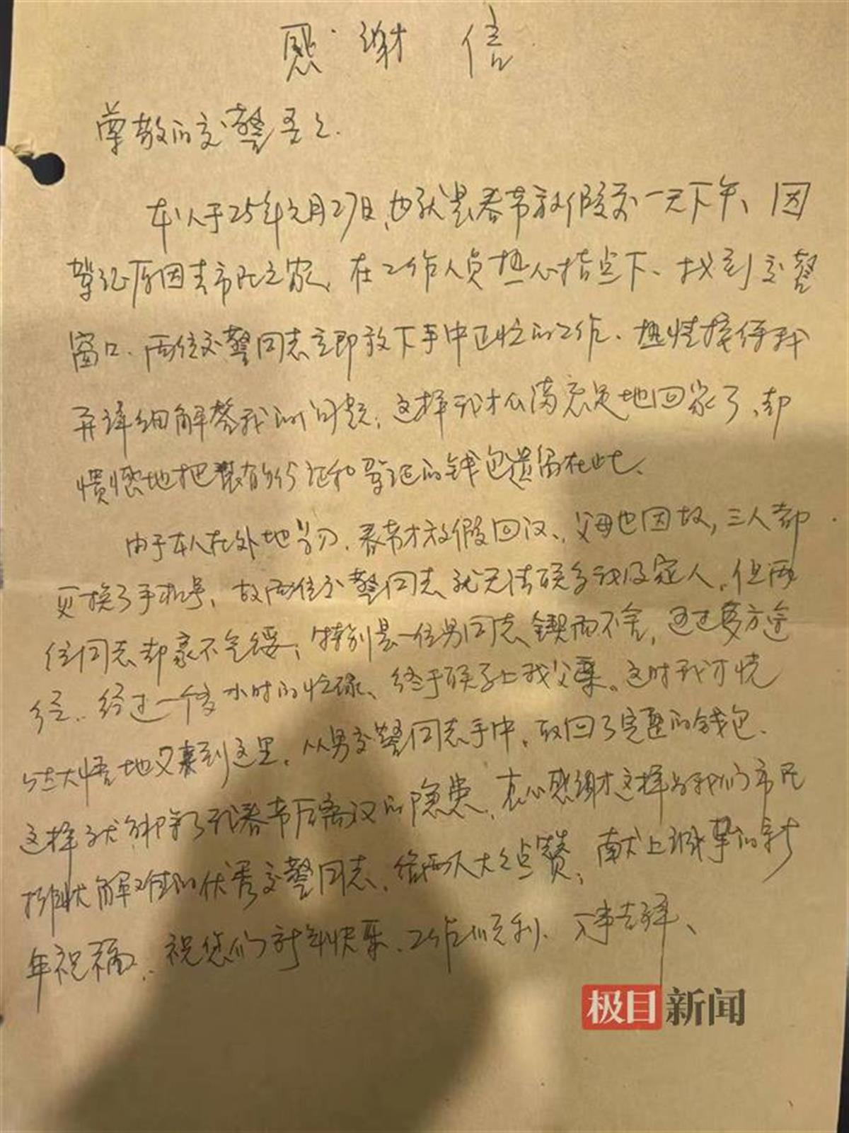 闫某在信中写道:“衷心感谢这样为我们市民排忧解难的优秀交警同志,给两人大大点赞,献上诚挚的新年祝福。”
