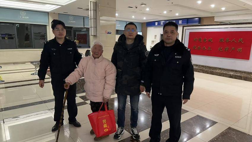 舒永俊一边送去热水耐心安抚,民警郑博、詹鹏程一边核实其身份。通过信息排查,民警确认了老人的身份。婆婆姓汤,今年已有95岁高龄。