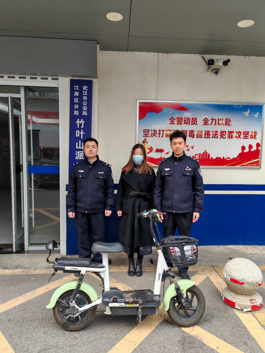 1月23日晚8时许,武汉市公安局江岸区分局竹叶山派出所民警李昊、侯强调看视频时发现,一男子在竹叶山地铁站出口处四处张望,随后将一辆电动车缓慢推行离开。