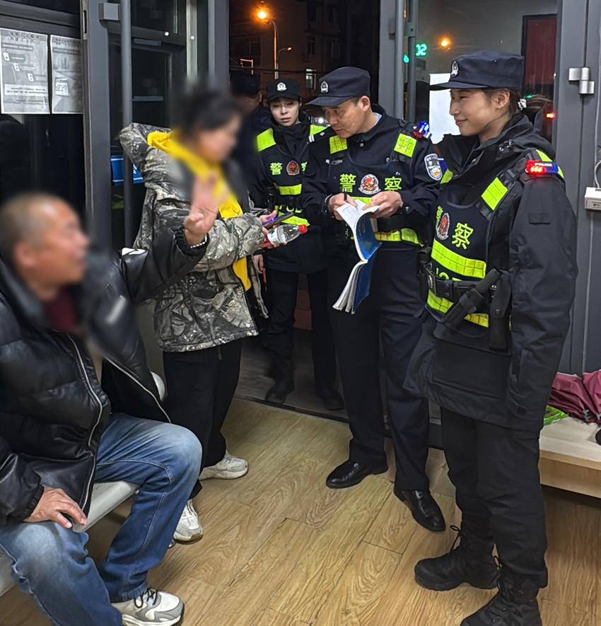 爹爹被民警搀扶下车后,因尚未醒酒,对身边的民警辅警有些排斥,也不愿沟通交流。为了让爹爹卸下心防,步巡队民警李新伟主动与其攀谈起来,并从车内拿了一瓶矿泉水给爹爹漱口醒酒,这一暖心的举动拉近了两人的距离。随后,李新伟又与辅警潘梦婷一道搀扶爹爹前往警务站休息。