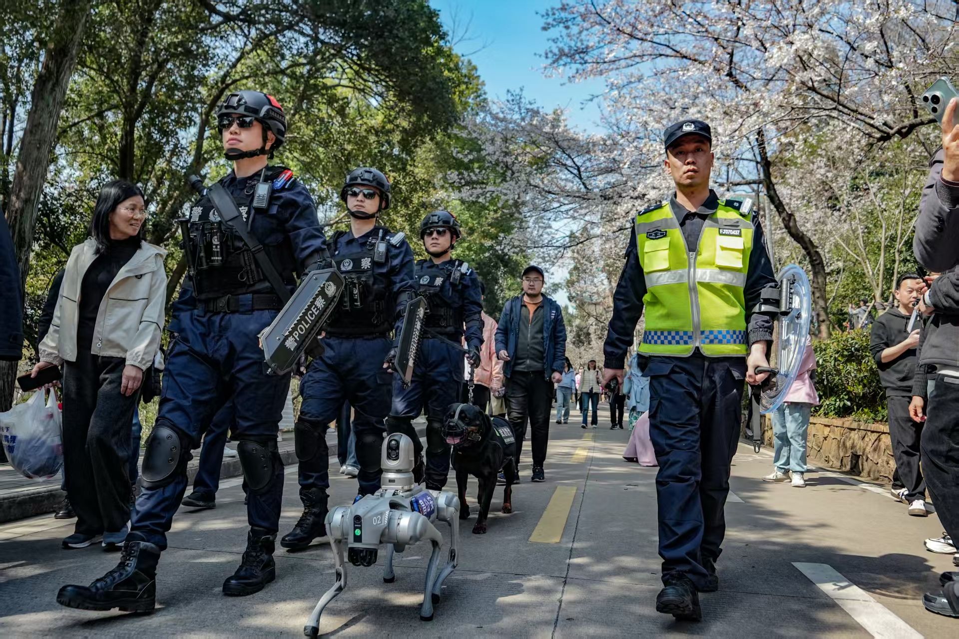 “樱花虽美,安全第一,请勿拥挤”,在武汉大学樱花大道,机器狗“小珈”成为新晋“网红”。这只背着警灯、搭载全景摄像头的小家伙,在民警的带领下,同警犬“Falcon”一起开展编队巡逻,引得不少小朋友上前合影。与此同时,武昌公安联合校方在核心赏樱区布置的人流计数器、热力感知设备及无人机蜂巢系统,配合PTU快反小组,构建起“空地一体”的智能巡控网络。