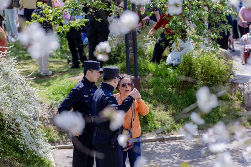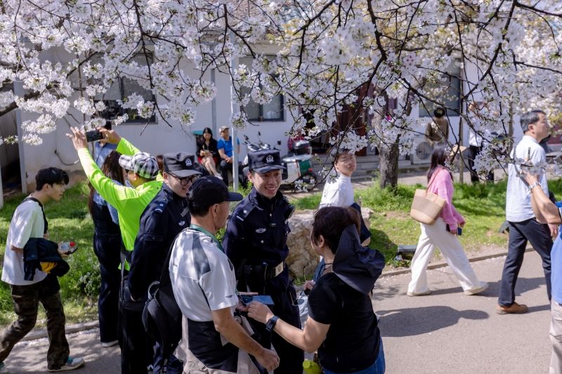 “赏樱服务驿站”成为春日里最温暖的坐标。警方设在各景区的大门、广场、摆渡车、缆车售票等候处及热门打卡地的治安服务站,随时接受群众报警求助、提供便民服务。在梨园地铁站,轨道公安的“移动服务站”日均帮助游客找回遗失物品32 件,最快响应时间仅8 分钟;在东湖绿道,当七旬游客突发心脏病,东湖公安民警及“东湖义警”迅速用身体筑起人墙开辟“生命通道”,20分钟内将其护送至医院;面对迷路的外国留学生,武昌公安巡逻民警不仅用双语提供帮助,还送上精心制作的《留学生服务指南》。
