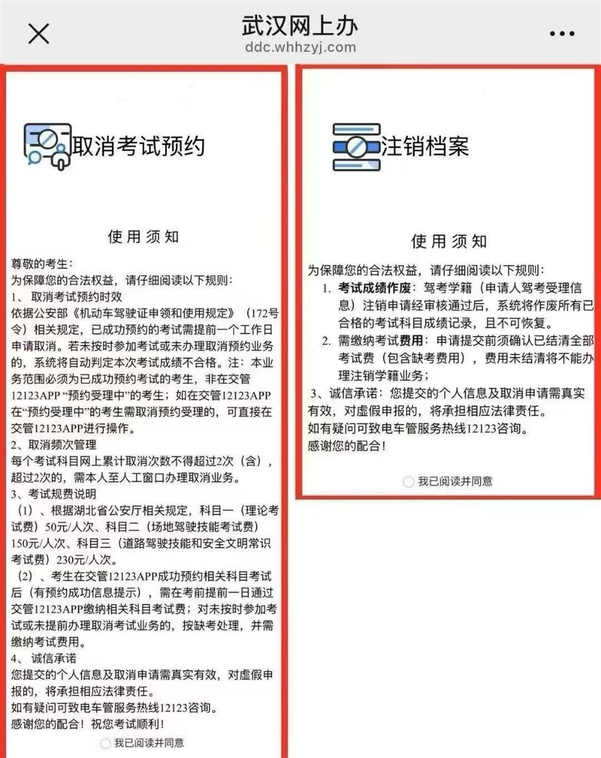 特别提示:每个科目网上办理取消考试预约次数累计不超过2次,超过的需在窗口办理。办理取消考试预约,请提前一个工作日在武汉交警公众号申请(办理时间:工作日8:30至17:00)。