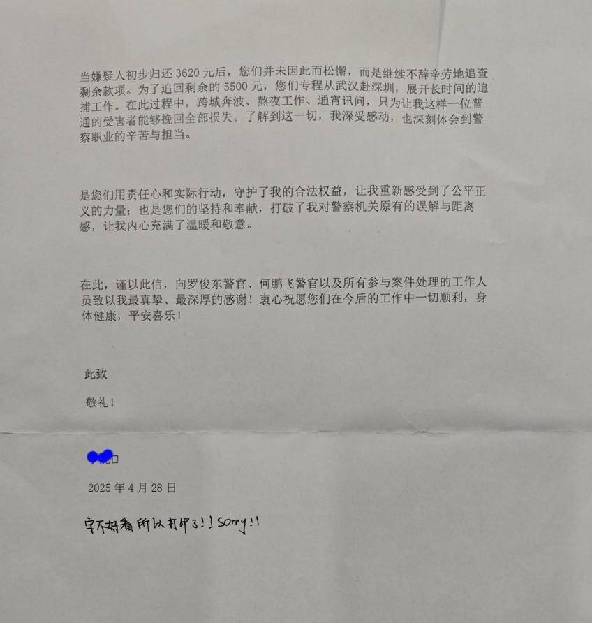 得知案件告破,李女士非常感动,向民意所寄来感谢信。5月中旬,李女士专程到民意所给办案民警送锦旗致谢。