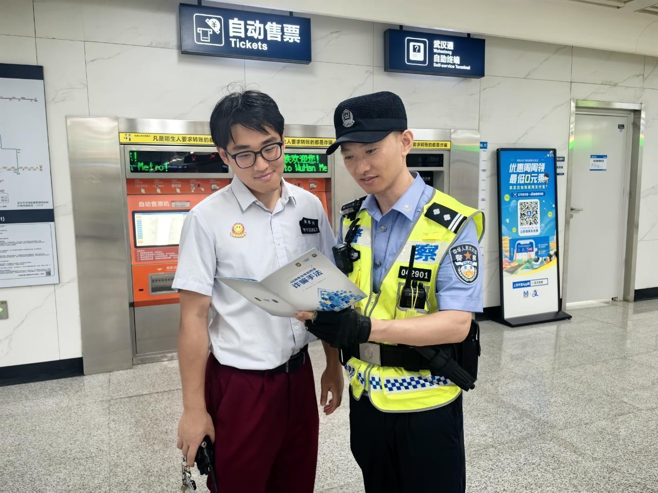 “凡是在电话中索要银行卡信息及短信验证码的,都是诈骗!”6月18日19时许,武汉地铁7号线横店站,轨道交通管理民警正向过往乘客开展反诈宣传,提醒市民群众提高警惕,谨防上当受骗。