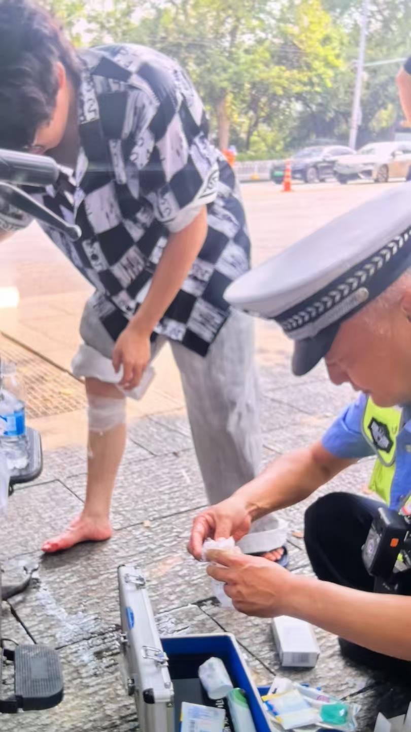 民警孙红彬立即上前将受伤男子扶起,将人和车转移至岗亭边。随后,民警从警车上取出急救箱,使用碘伏、纱布等物品,小心翼翼地为伤者清理伤口、消毒包扎,并叮嘱道:“我帮你伤口消毒包扎只是简单的应急处置,等下一定要去医院再检查一下,别大意。”