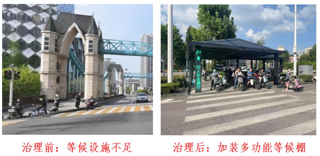 功能融合增便利。在路口增设4处多功能等候棚,整合行人信号灯功能,既为群众提供遮风挡雨、夏日遮阳的等候空间,设计风格又与周边商圈景观相协调,实现功能性与美观性统一。