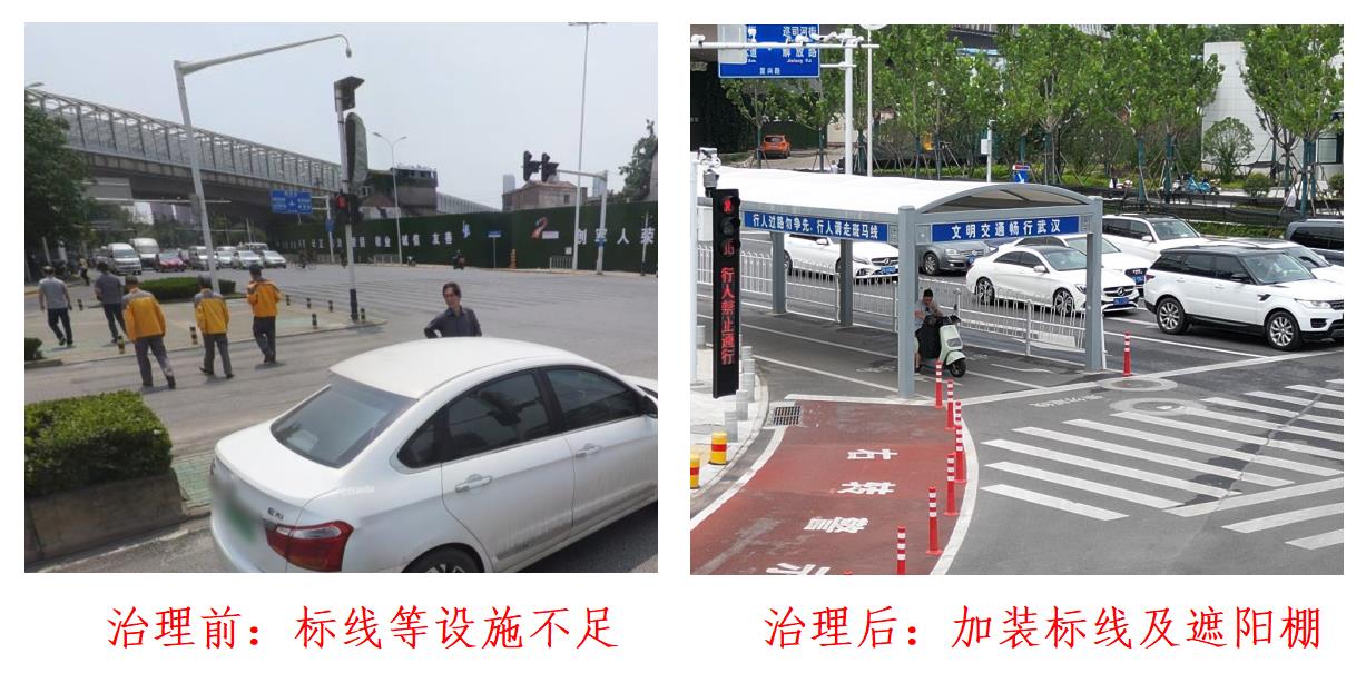 空间扩容提效能。联合园林部门削减西北侧绿化带,扩容过街等候区并同步调整人行横道,扩大候驶空间;协调市政部门对西南侧等候区进行“零高差”改造,保障老年人、儿童等群体通行安全。