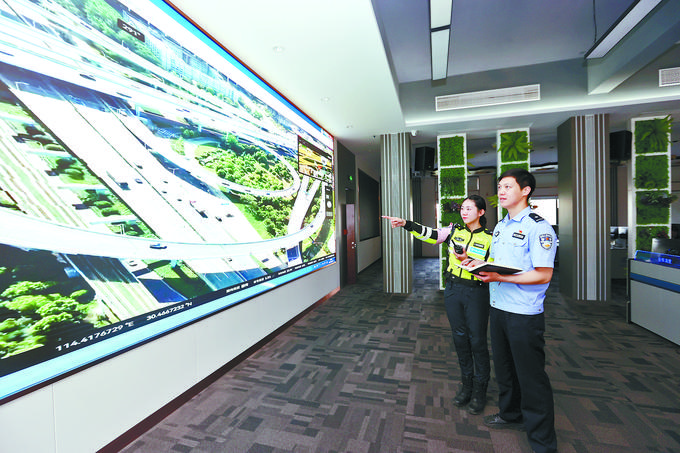近日,武汉市公安局东湖新技术开发区分局民警分析路况信息。(武汉市公安局供图)